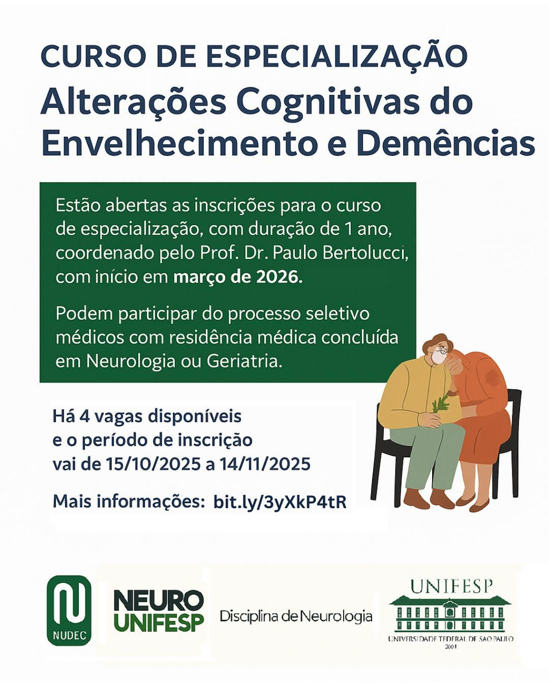 Curso de Especialização da Unifesp para médicos: Alterações Cognitivas do Envelhecimento e Demências. Início em março de 2026. Inscrições abertas até 14/11/2025.